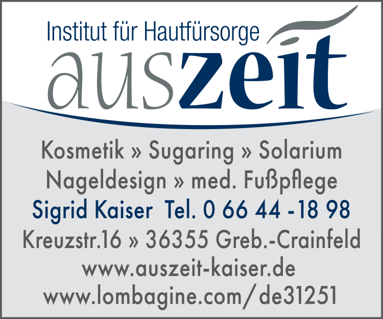 Die Adresse von auszeit Inh. Sigrid Kaiser Institut für Hautfürsorge lautet: Kreuzstr. 16, 36355 Grebenhain-Crainfeld