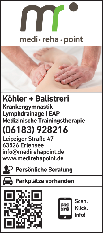 Die Adresse von medi-reha-point Köhler & Balistreri Physiotherapie lautet: Leipziger Str. 47, 63526 Erlensee