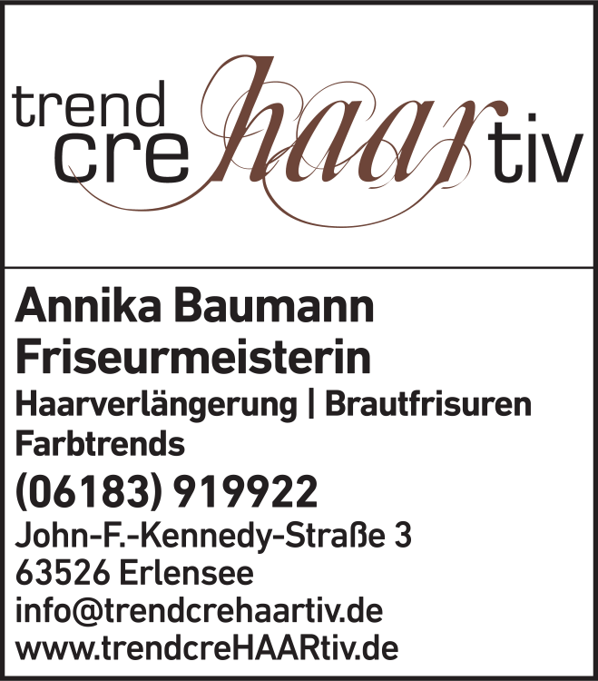 Die Adresse von trend crehaartiv Annika Baumann Friseur lautet: John-F.-Kennedy-Str. 3, 63526 Erlensee