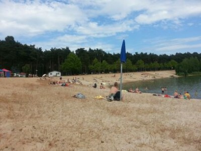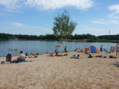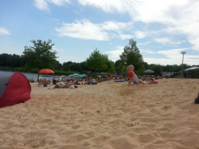Der Badesee hat einen großen Sandstrand am Nordufer. Hier kann man in der Sonne liegen oder mit den Kindern eine Sandburg bauen. An zu heißen Tagen sorgt ein Sonnenschutzsegel für etwas Schatten.