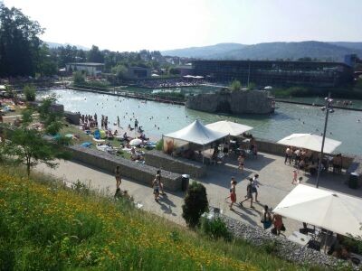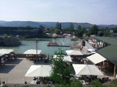 Ein Strand wie im Urlaub und klares Wasser für ungetrübte Badefreuden, ein Sprungfelsen mit Wasserfall und Kletterwand, eine große Rutsche, Liegewiesen auf verschiedenen Ebenen, Beachvolleyball-Felder für die Sportfans und ein Kiosk mit großzügiger Terrasse zum Verweilen, Flanieren und Genießen.