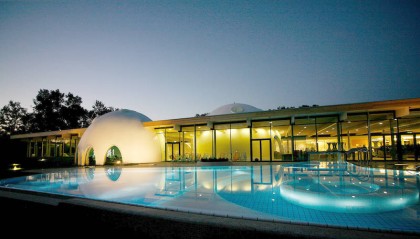 Das Schwimmerbecken liegt als Belvedere auf dem Niveau des Gebäudedaches und öffnet den Blick auf die Alpensilhouette.