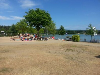 Der Badesee hat einen großen Sandstrand am Nordufer. Hier kann man in der Sonne liegen oder mit den Kindern eine Sandburg bauen. An zu heißen Tagen sorgt ein Sonnenschutzsegel für etwas Schatten.