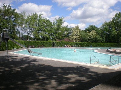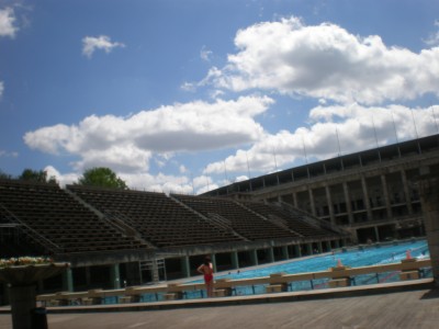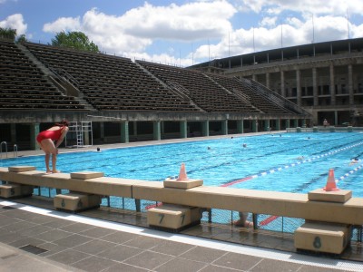 Das Freibad liegt mitten im historischen Ensemble des Berliner Olympiastadions. Frau Riefenstahls Bilder lassen grüßen, wenn man hier ist! Die alte Wettkampfstätte mit ihren (gesperrten, weil verfallen) Besuchertribünen ist mit einem 50m-Becken und einer 10m-Sprunganlage ausgerüstet. Wenn nicht Hertha gerade nebenan spielt, sind auch genügend Parkmöglichkeiten vorhanden.