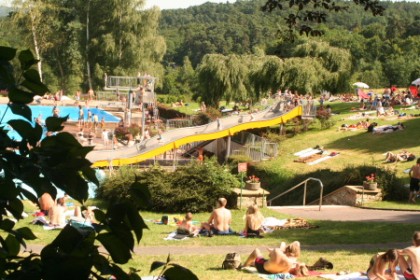 Das beheizte Herborner Freibad bietet Badespaß in einem Schwimmbecken mit abgetrenntem Nichtschwimmerbereich und einer Sprunganlage mit einem 1 und 3 Meter Brett.