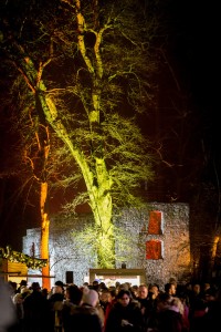 Romantischer Weihnachtsmarkt im winterlichen Stadtpark mit Blick auf die Schlossruine