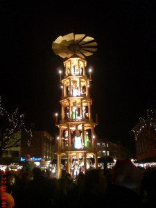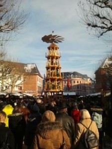 Die elf Meter hohe, reich verzierte Weihnachtspyramide verzückt direkt am Höfchen, dem Hauptzugang zum Markt. Und wer sich hier alles tummelt: vom Fastnachter über das Mainzelmännchen bis zu dem Römer Drusus, dem Bischof und Gutenberg können Sie hier zahlreiche Mainzer Persönlichkeiten "treffen".